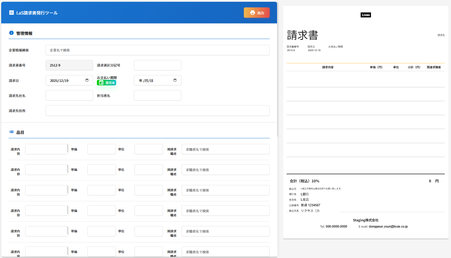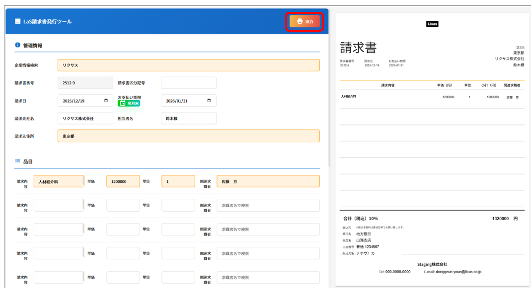 ⑥入力した情報は、右画面に紐づいて入力されています。左画面上部の「出力」をクリックすると、請求書がPDFで表示されますので、印刷orダウンロードしてお使いくださいませ。