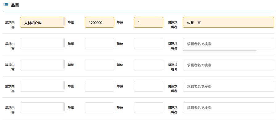 ※下記画像は、人材紹介料として紹介した求職者(佐藤 亘 様)1名分、1200000円を請求したい場合の入力例となります。