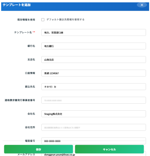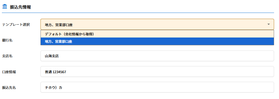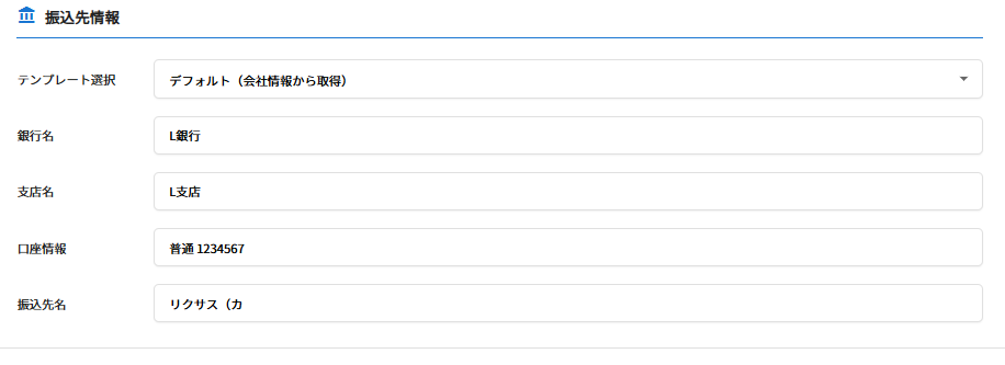 ※管理メニュー>情報管理「請求書発行情報の設定」にて振込先情報を入力しておくと、自動で反映されるようになります。