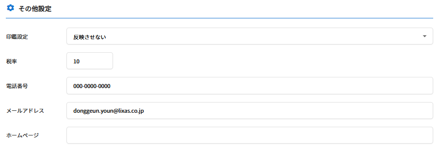 ⑤その他設定にて、印鑑画像の反映の有無と、税率を設定します。