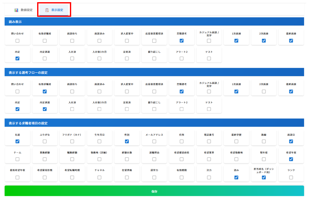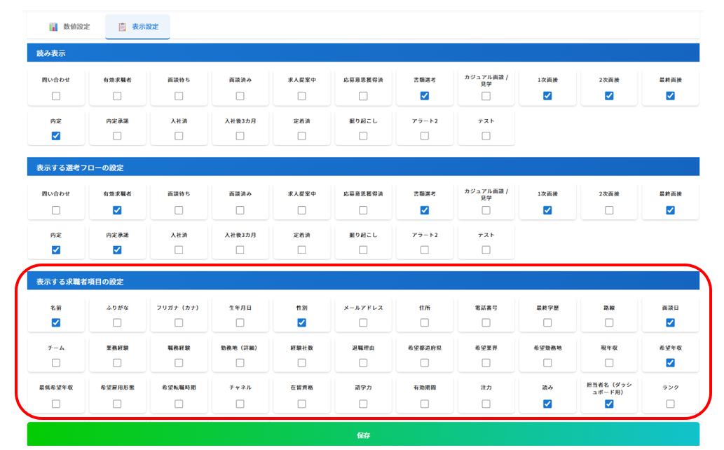 ダッシュボードに表示される求職者項目については、ダッシュボード設定画面の「表示する求職者項目の設定」に☑がある項目が表示されます。