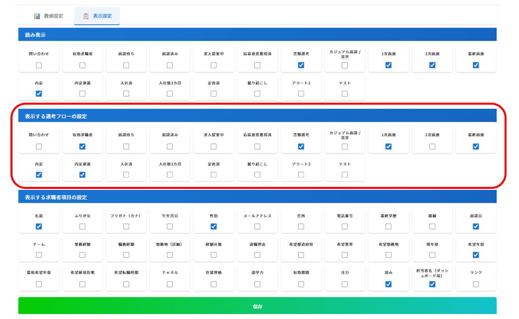 なお、「表示する選考フローの設定」には、管理メニュー>項目の設定「選考フロー」で設定した項目が表示されています。