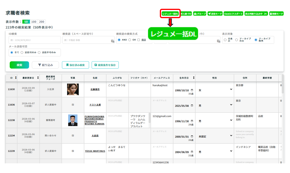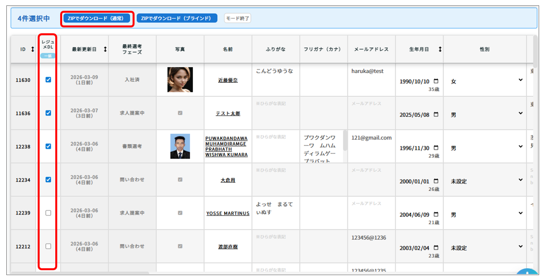 ②レジュメダウンロードのチェックボックスが表示されるので出力したい候補者をクリック