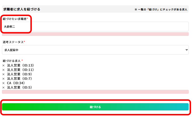 紐づけしたい「求職者名」または「ID」を入力し候補者を選択