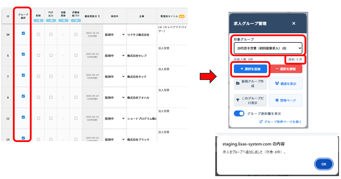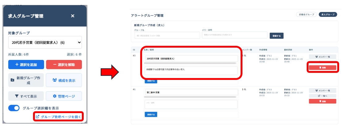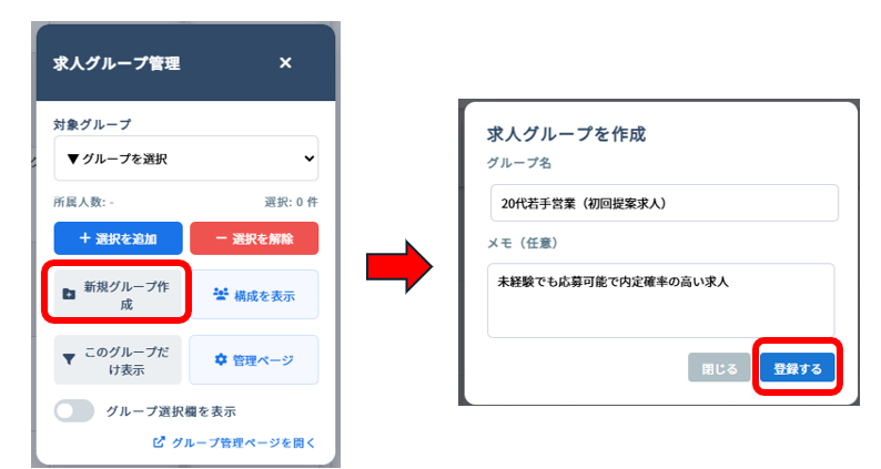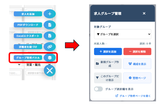 「求人グループ管理」「グループ管理ページを開く」をクリック